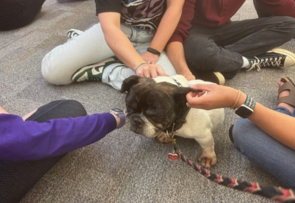 Each week, the familiar sound of paws on the tile floor signals something special – the arrival of the therapy dogs. Chaos, an 11 ½-year-old French bulldog, walks in with the calm confidence of a seasoned pro, his special leash and collar glinting under the library lights. The preparation is almost ritualistic: a bath, a nail trim and a few minutes of quiet before the big visit.